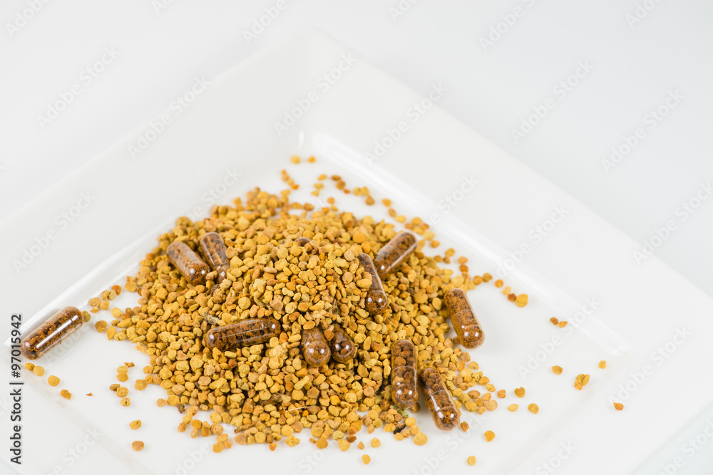Close-up of Some homeopathic pills with bee pollen in scattered
