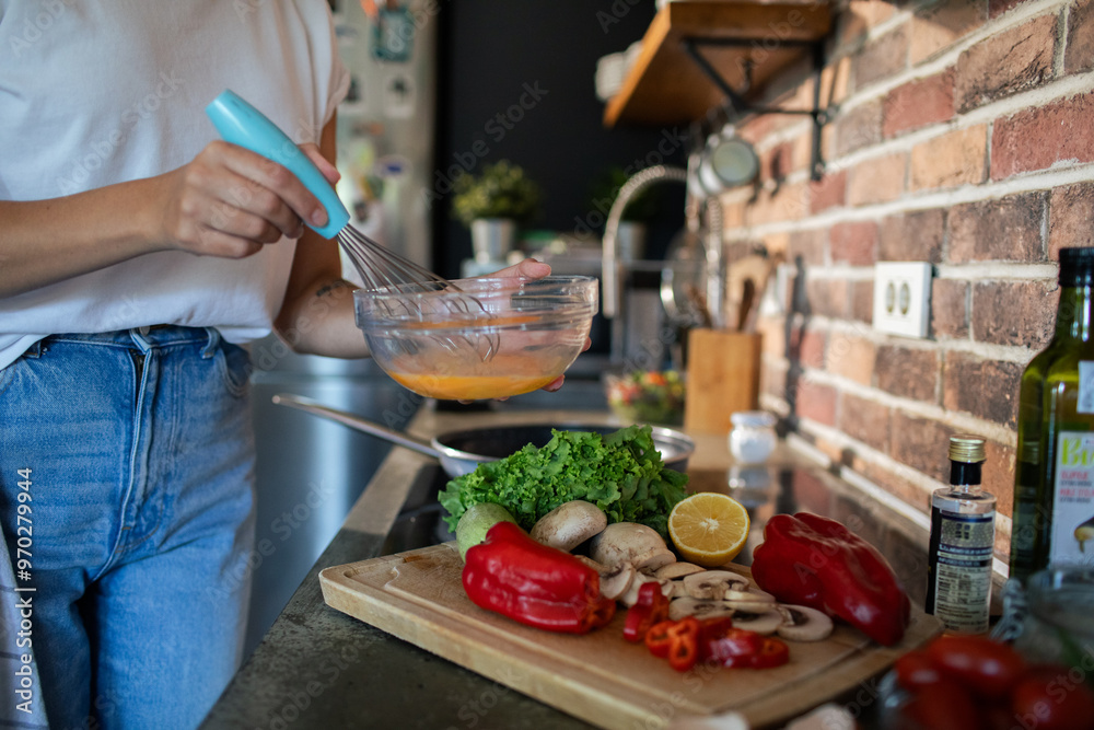 Woman whisking eggs for healthy meal prep with fresh vegetables in kitchen