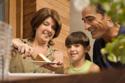 Girl and grandparents having cake