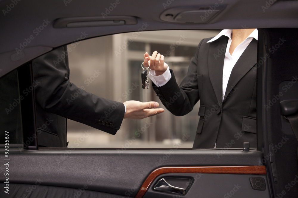 Car dealer giving buyer keys