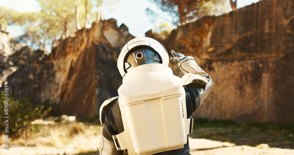 Back, explore and planet with astronaut in space to search for extraterrestrial civilization. Mission, mountain and universe with person in extravehicular mobility unit for discovery or journey