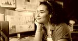 Business, thinking and woman in office, earphones and contemplation with sound, listening to music and podcast. Person, creative agency and entrepreneur with break, radio and calm with daydreaming
