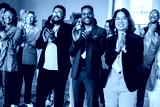 Diverse colleagues clapping at conference, happy employees celebrating success, unity in business