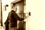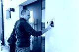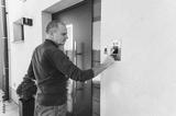 A man pressing a doorbell intercom at the entrance of a modern building. He is dressed casually and appears to be waiting for someone to answer. The building has a sleek design with large glass doors