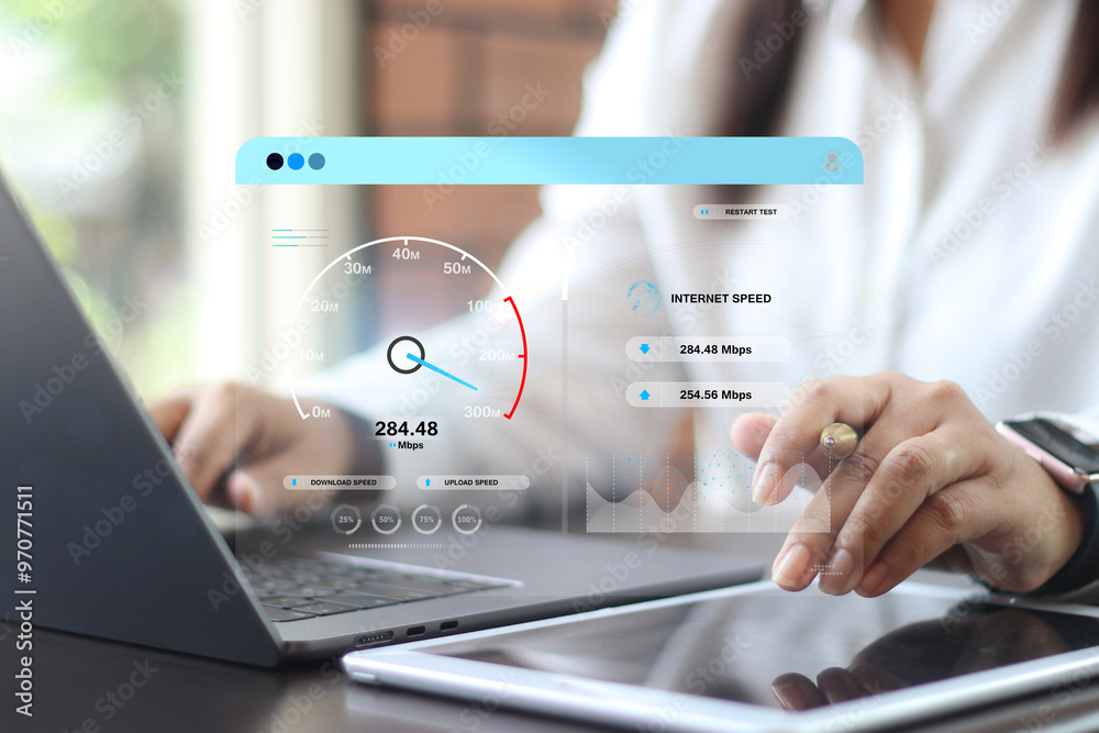 Fast internet connection with Metaverse technology concept, Programmer people working laptop with Virtual screen of Internet speed measurement, Internet and technology concept, 6G High-speed internet