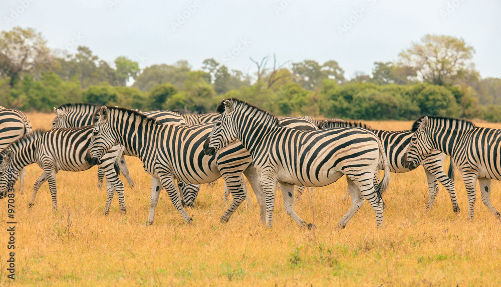 Zebras grazing on golden grass in a Botswana national park during a tranquil afternoon