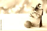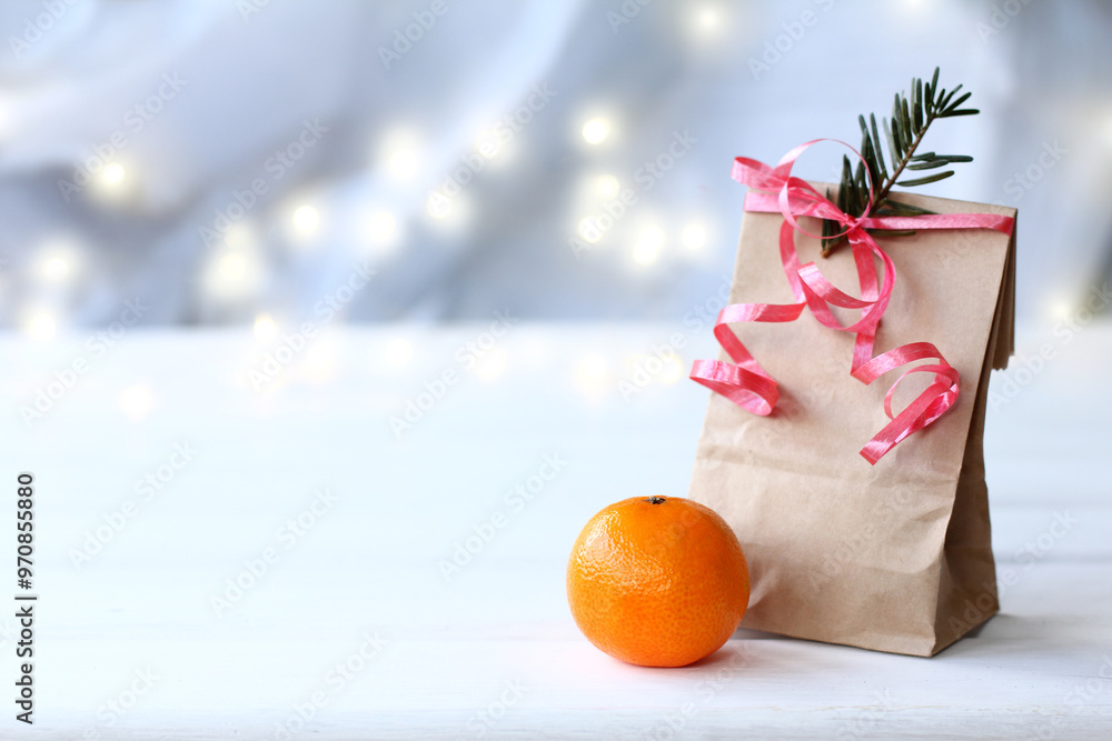orange tangerine against the background of a gift decorated with a ribbon and a spruce branch close-up. in anticipation of the Christmas holiday