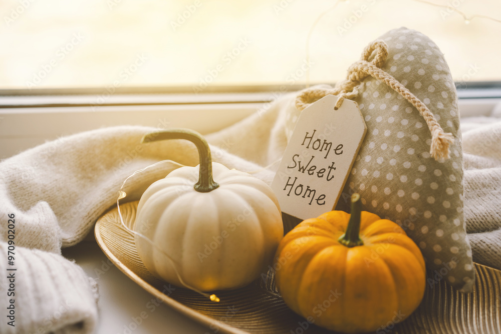 Two small pumpkins resting on a cozy beige sweater create a warm autumn atmosphere on a soft, neutral background. Autumn mood.
