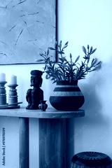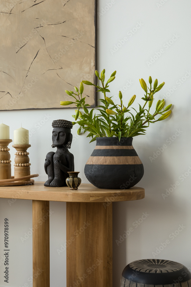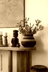 Black and white decor with ethnic sculptures. A stylish arrangement featuring ethnic-inspired sculptures and vases, set against a neutral backdrop for a striking contrast.