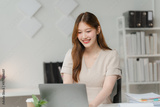 Focused and Productive: A young woman in a beige dress smiles brightly as she works on her laptop in a modern office setting. The image conveys a sense of focus, concentration, and professional succes