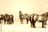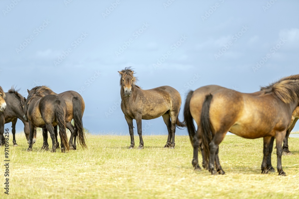 Braune Pferde stehen und grasen friedlich auf einer offenen Wiese unter einem klaren Himmel