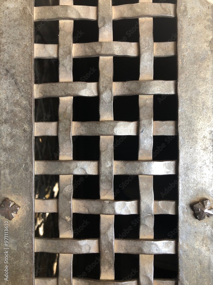 Metal wicker grille. Close-up. Industrial texture background, gray metal iron grille. Black and white ventilation, window grate.