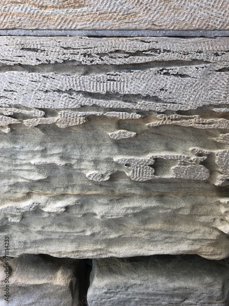 Stone with holes and thin white veins. Detailed close-up of weathered gray rock surface, washed away by water and wind. House wall.