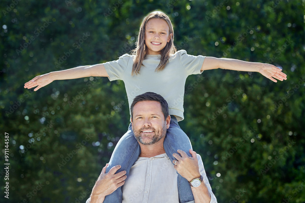 Portrait, airplane and girl with dad, outdoor and happy in nature, fresh air and relax in morning or plants. Spring, bonding and child with father, peace and kid in backyard, smile or calm in weekend