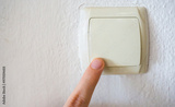 A finger pressing a light switch, representing an action of turning on or off electricity, energy-saving, or control over light concept.