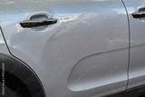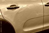 Lightly scratched, scraped and dented car door panel. Close up shot, no people