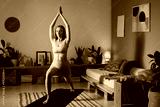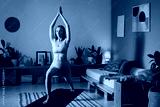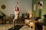 Young fit woman in beige tracksuit stretching legs and raising arms over head while practicing yoga exercises in home environment