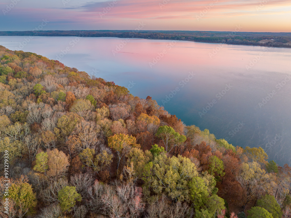 dawn over the Tennessee River near Colbert Ferry Park, Natchez Trace Parkway - late November aerial view