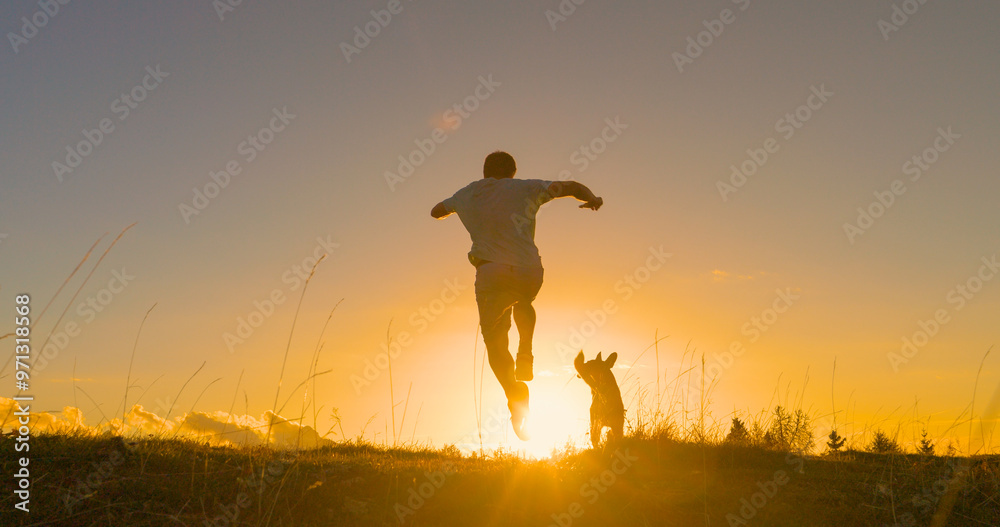 LENS FLARE, SILHOUETTE: Young man running with his dog towards a glowing sunset on a mountain. Guy and his pet leap into the air as the setting sun casts a golden glow over the grassy alpine meadow.