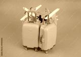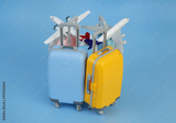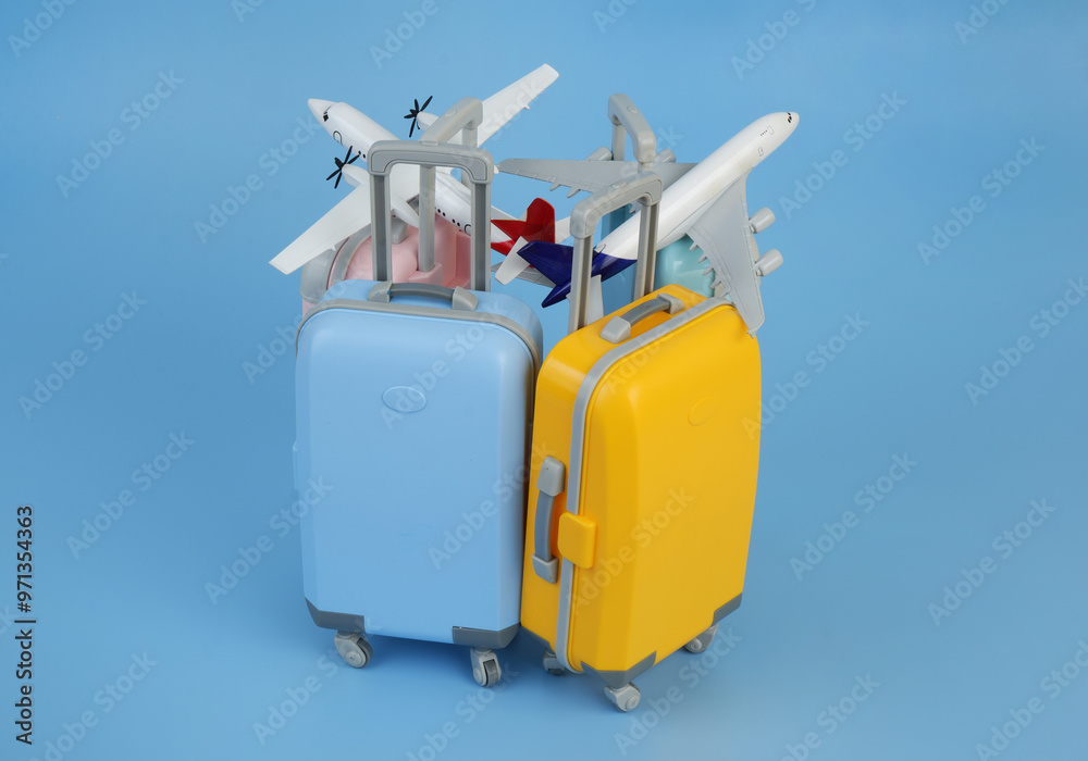 Airplane models on several travel suitcases on blue background. Different travel direction and tourism concept.