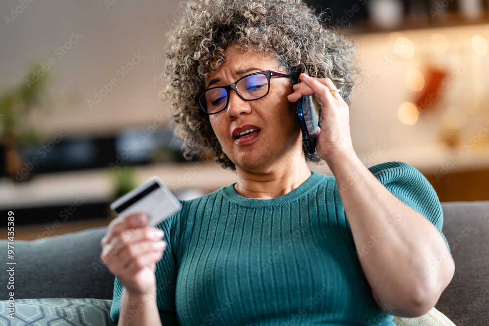 A worried woman holds her credit card and speaks on the phone, looking stressed. Her face is expressing concern and frustration.