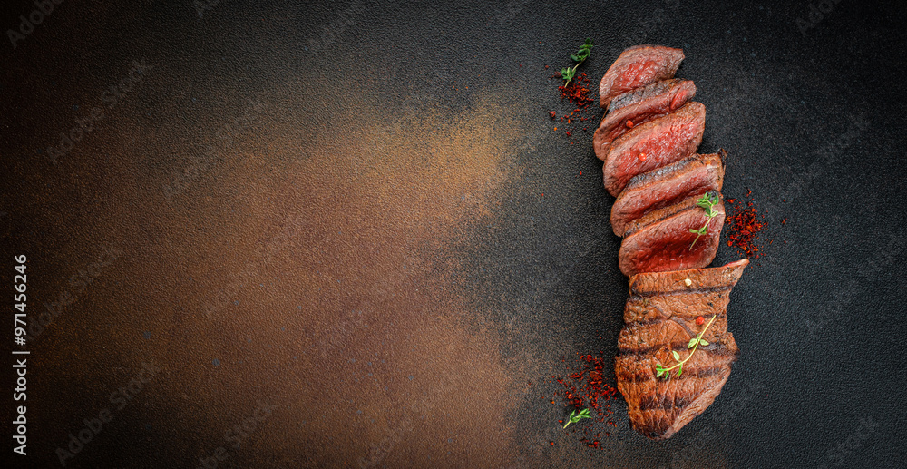 Cut rare rib eye steak on a dark background. top view. copy space for text