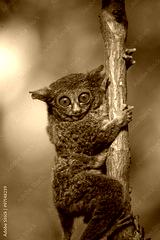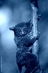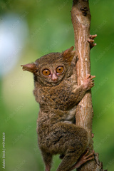 Tarsius sits on a tree in the jungle. close-up. Indonesia. Sulawesi Island. An excellent illustration.