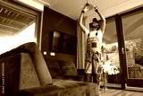 Male Eelectrician finished mounting ceiling lamp - installing a fluorescent light bulb. High quality photo