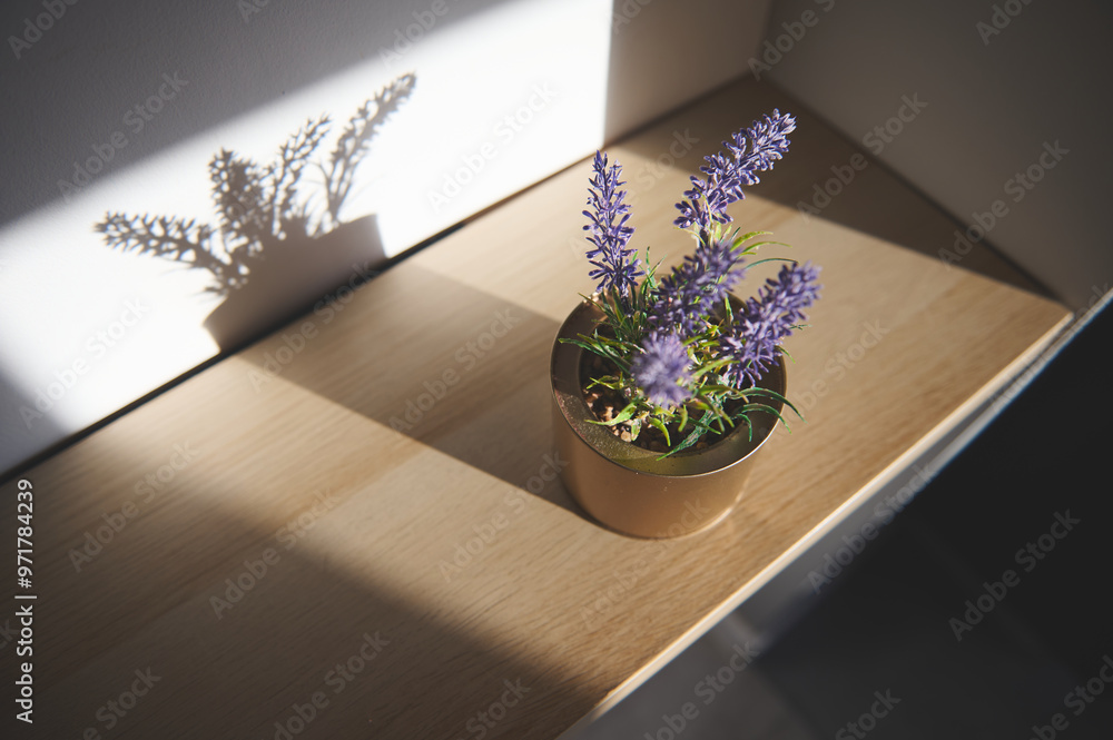 Decorative lavender plant casting a detailed shadow on a sunlit wooden shelf creates a tranquil and natural atmosphere