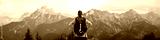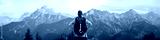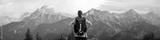 View from behind of a female hiker with backpack standing on top of a mountain looking at beautiful view