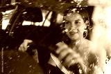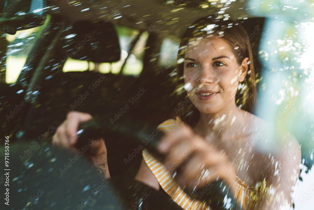 Young caucasian woman with brown hair and brown eyes with a smile on her face. Capturing pristine fun moments full of happiness while driving in the car, on the road to a vacation destination. Smiling