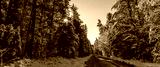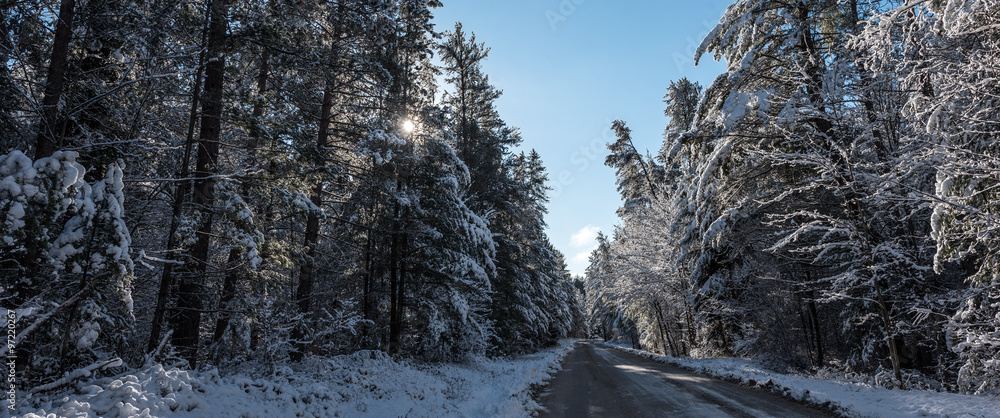 Snow covered pines and sun piercing through shadowed forests along rural roads. Sunny winter morning tall pine forests covered in fresh fallen snow.