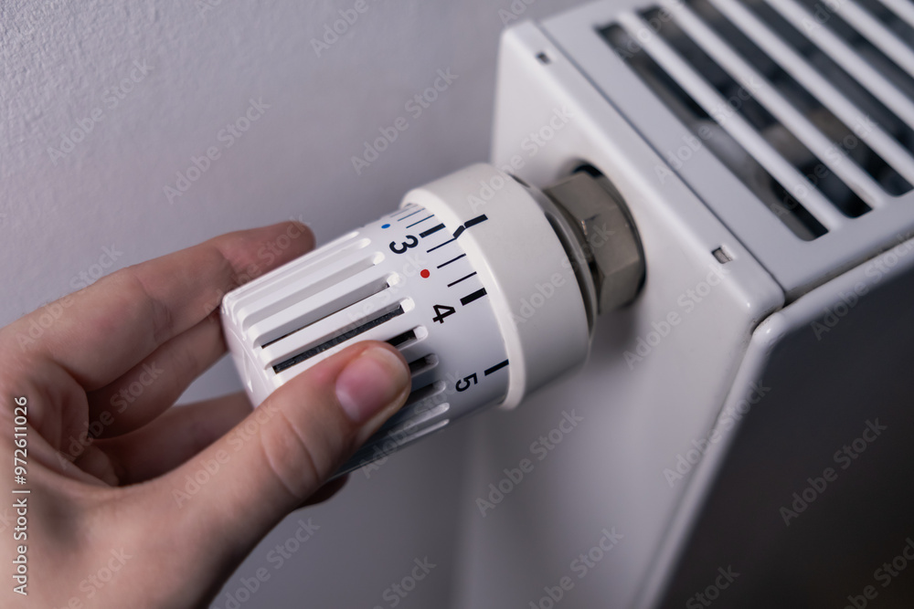 A woman's hand turns the handle of the heating radiator. Heating in the apartment, at home. Prices for heating.