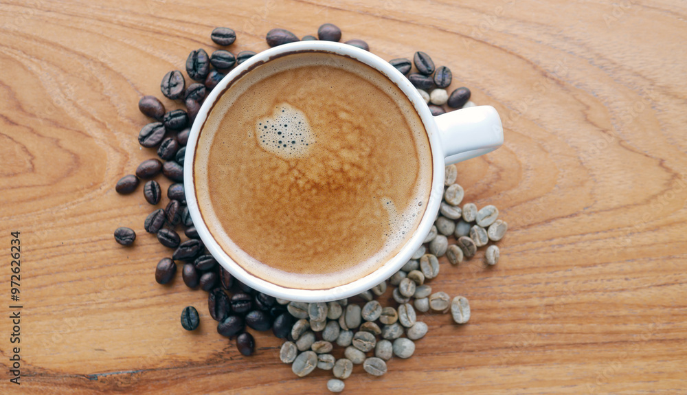 Crema espesso coffee cup, espresso coffee and coffee bean on wooden table