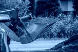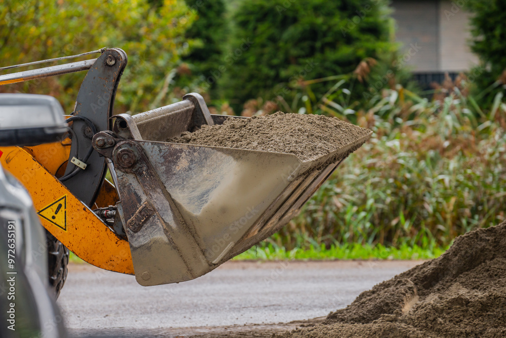 Full construction front loader bucket close up for excavation works of cement and gravel in road construction project