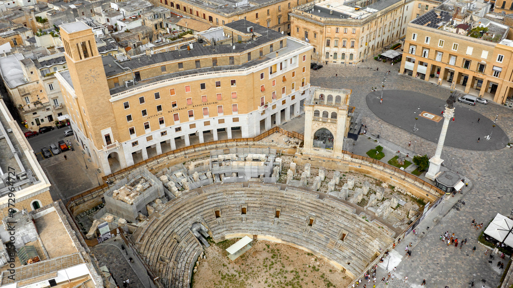 Aerial view of the Roman amphitheater and Palazzo del Seggio, better known as "Il Sedile".They are located in Sant'Oronzo square in the historic center of Lecce, Puglia, Italy.