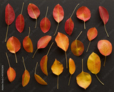 Autumnal background with yellow, orange and red pear tree leaves on a dark material