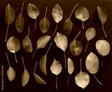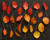 Autumnal background with yellow, orange and red pear tree leaves on a dark material