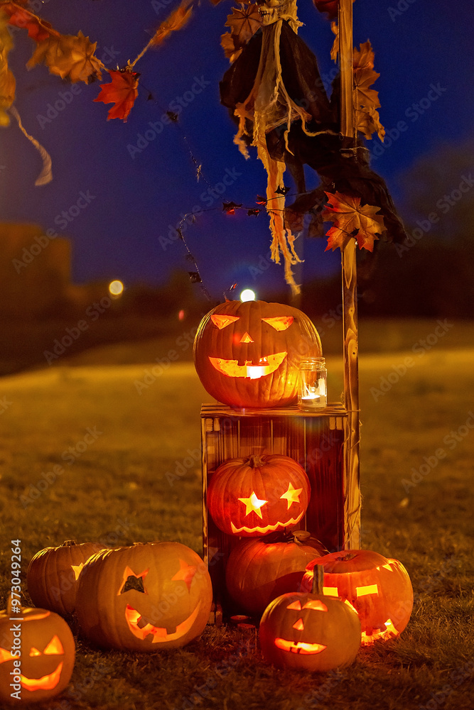 Two boys in the park with Halloween costumes, carved pumpkins with candles and decoration.