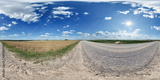 hdri 360 panorama of blue sky with awesome clouds on roadside of gravel road among fields in equirectangular full seamless spherical projection, for VR AR content or skydome replacement