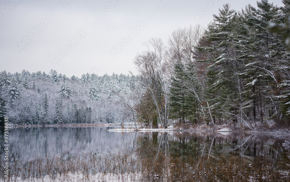 Still waters reflect waterfront forests. Light snow under subdued lead grey overcast winter sky makes beautiful waterfront forest.