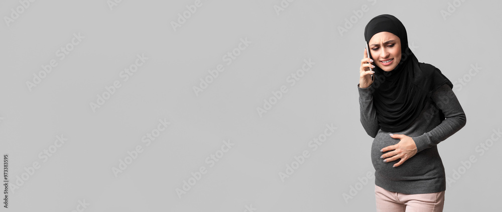 Pregnancy Pain Concept. Pregnant muslim woman in hijab suffering from abdominal cramps, calling to doctor for consultation and help, grey background