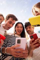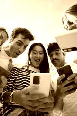 Vertical. Diverse group young people in circle staring in surprise at cell phone together outdoor. Amazed generation z student friends using colorful mobiles enjoying interesting social media content
