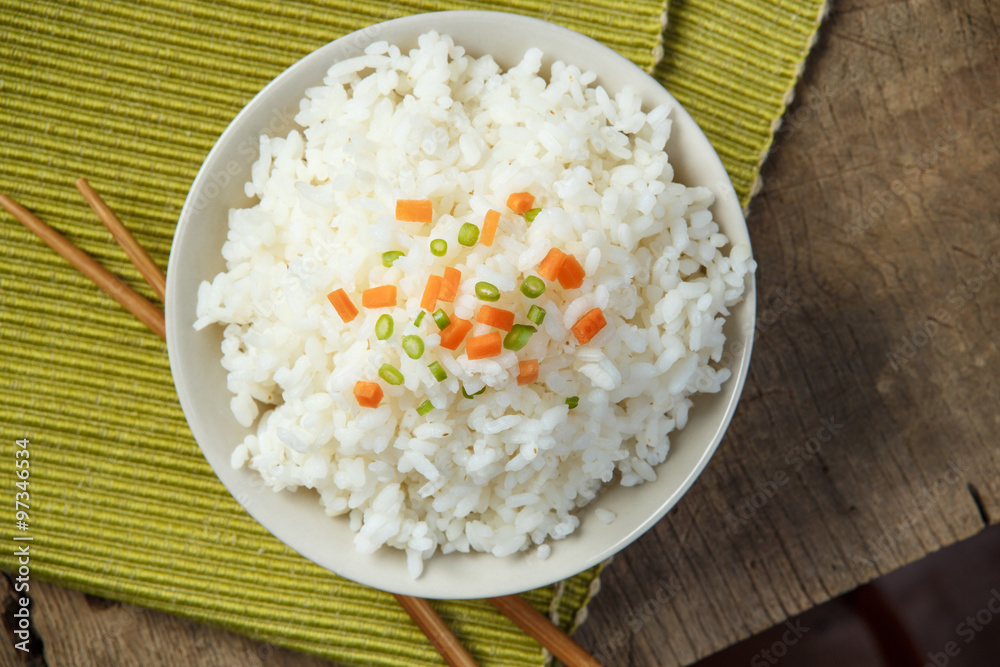 Jasmine rice with chopsticks on a fabric mat