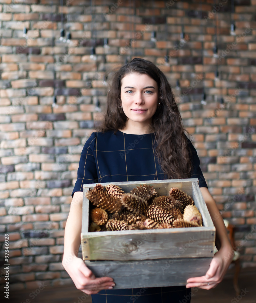 The girl holds in hand a basket with fir cones.