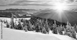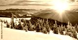 Snow covered trees and mountain peaks in the distance with sunlight and snow flakes.