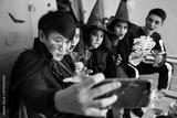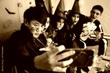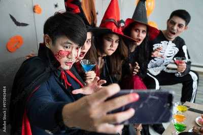 Young Asian people, a group of five persons, in scary costumes selfie their own photo. Group of friends having fun at a party in a nightclub to celebrate Halloween festival.