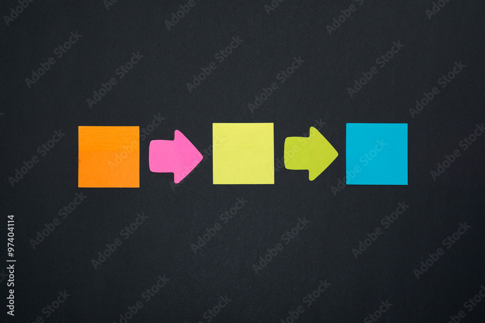 Paper notes and arrows on black board