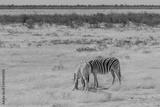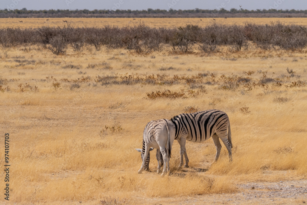 Telephoto shot of two Burchell's Plains zebras -Equus quagga burchelli- grazing on the plains of Etosha National Park, Namibia.