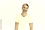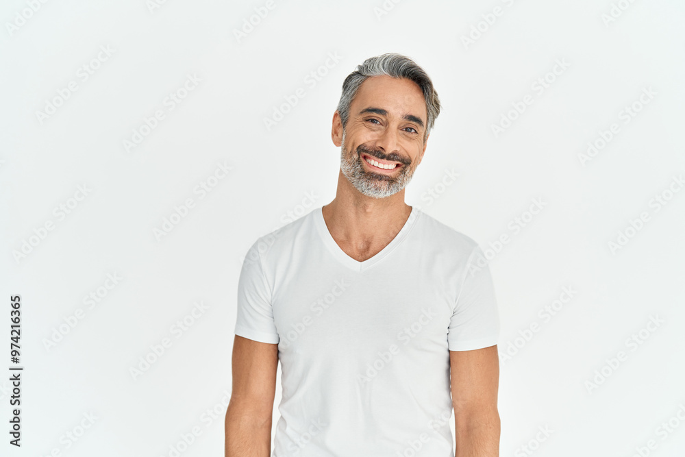 Smiling mature man wearing t-shirt isolated on white background. Portrait. Happy middle aged older guy, confident mid adult handsome bearded gray-haired male model in his 40s looking at camera.
